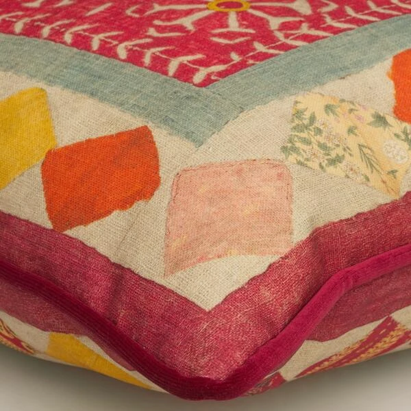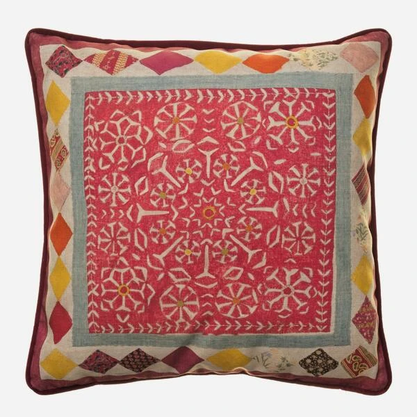 earthy red background, surrounded by diamonds of patterned colour.