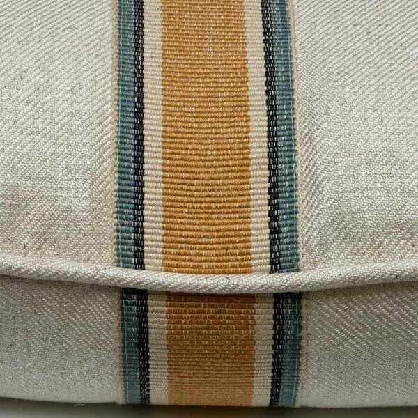 Linen cushion with a gold and teal medal stripe